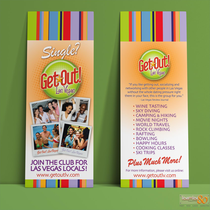 Logo, branding and rack card print design for Las Vegas singles club Get Out!