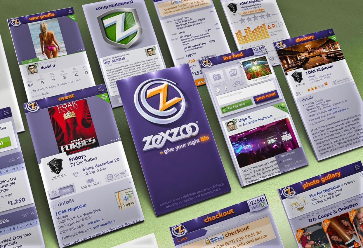 Logo design and brand identity creativity displayed in the business cards designed for nightlife hosting services company, zexzoo™ Las Vegas