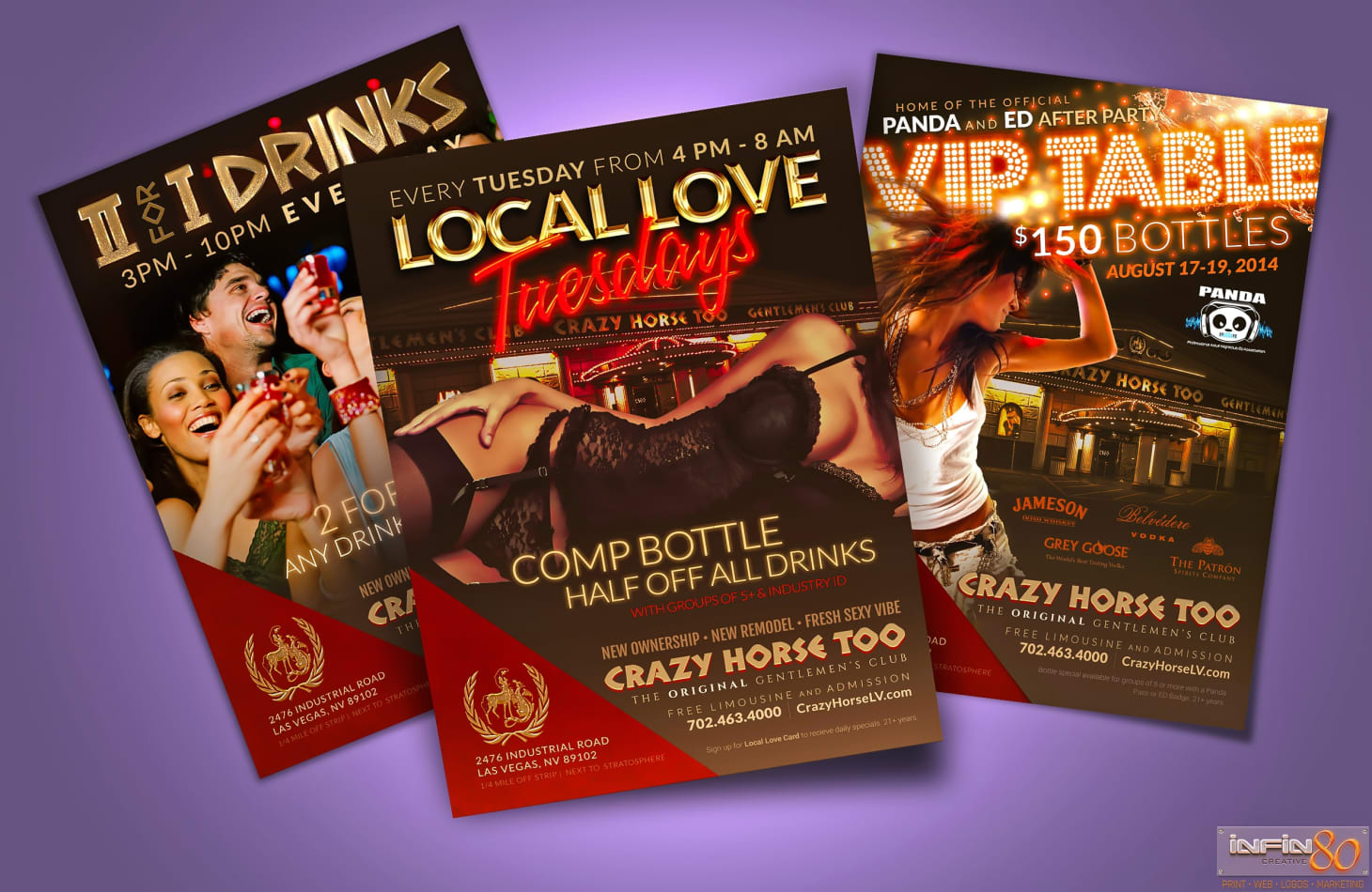 Custom branded flyer graphic design to market weekly events at the Crazy Horse Too in Las Vegas