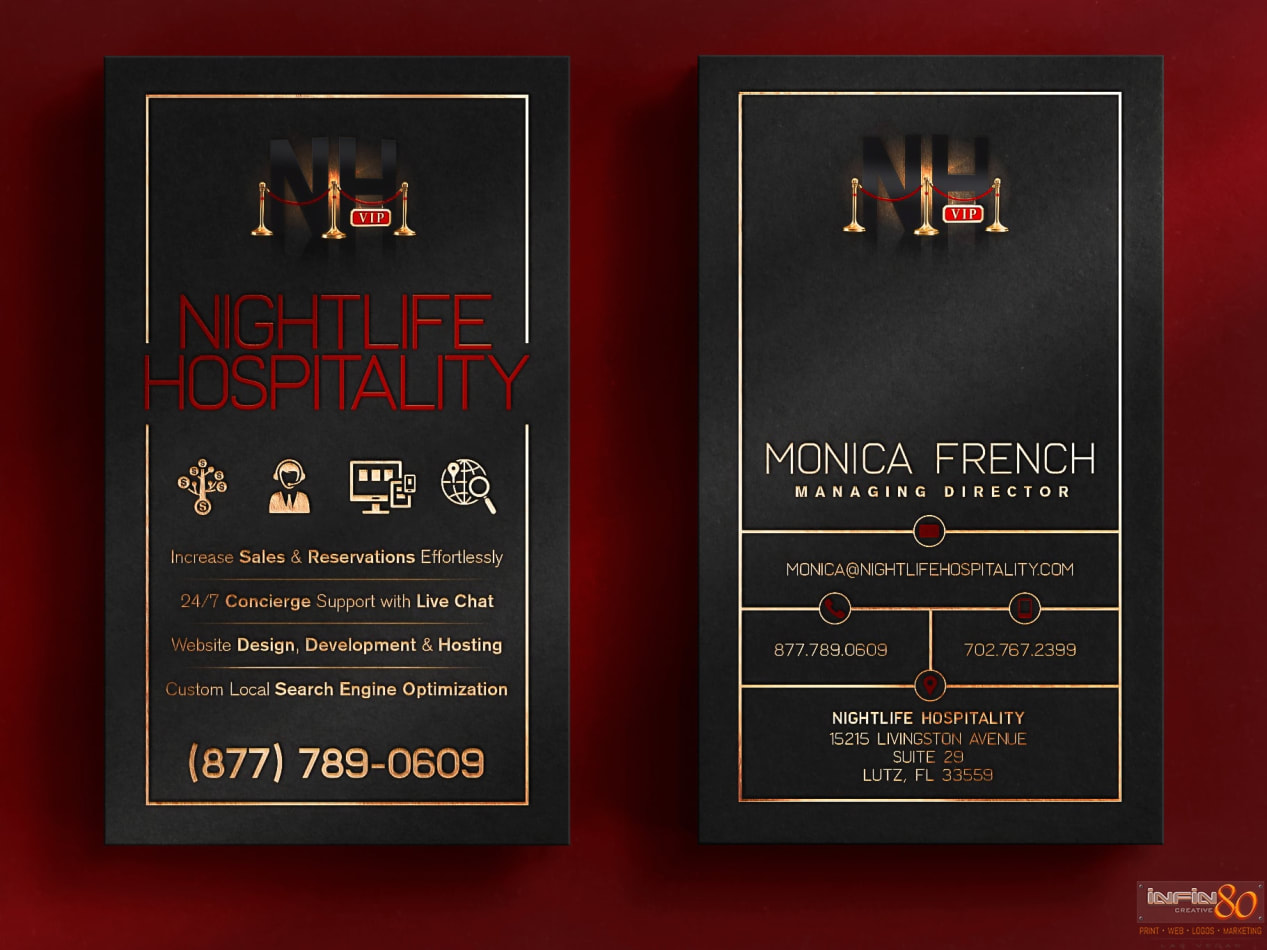 Logo, brand identity and business card design for Nightlife Hospitality inc. special print techniques like gold foil, spot UV and embossing