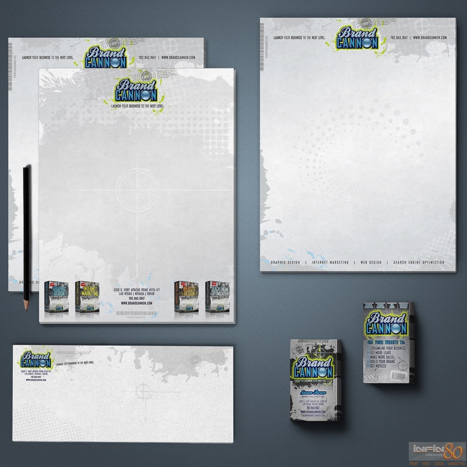 Business cards, logo and branded corporate stationary custom created for our ad and marketing company startup, Brand Cannon®