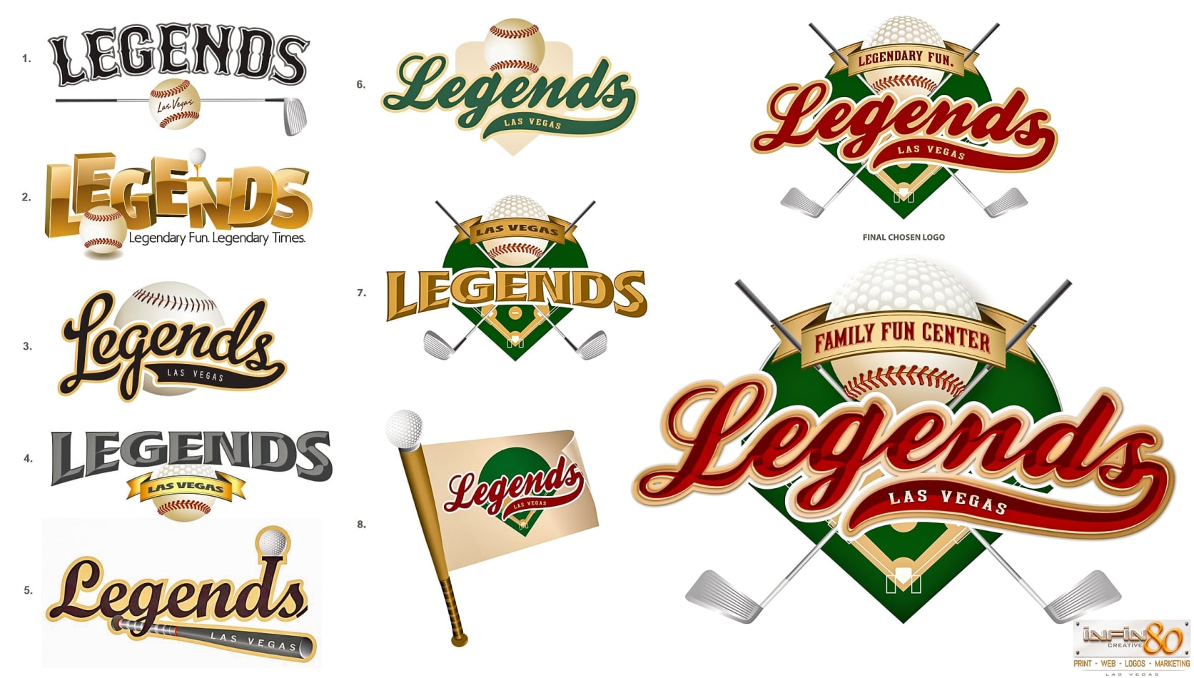 Ideas, sketches and logo design concepts for Legend’s, a sports-themed family fun park centered around baseball and golfing activities that was to be built in Las Vegas