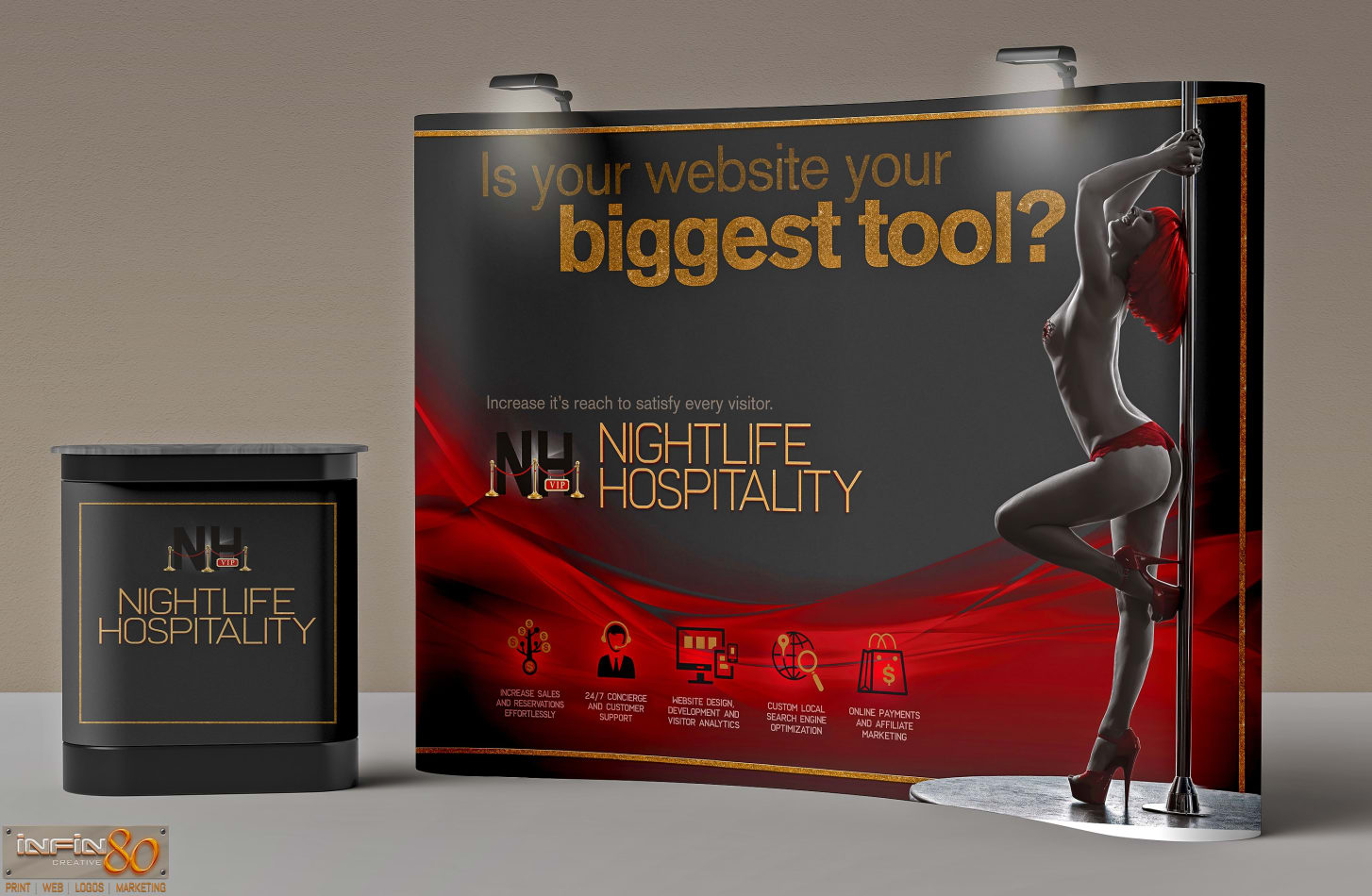 Classy black & gold Nightlife Hospitality logo design + 10ft Pop Up Wall trade show display graphics for AVN Las Vegas Convention