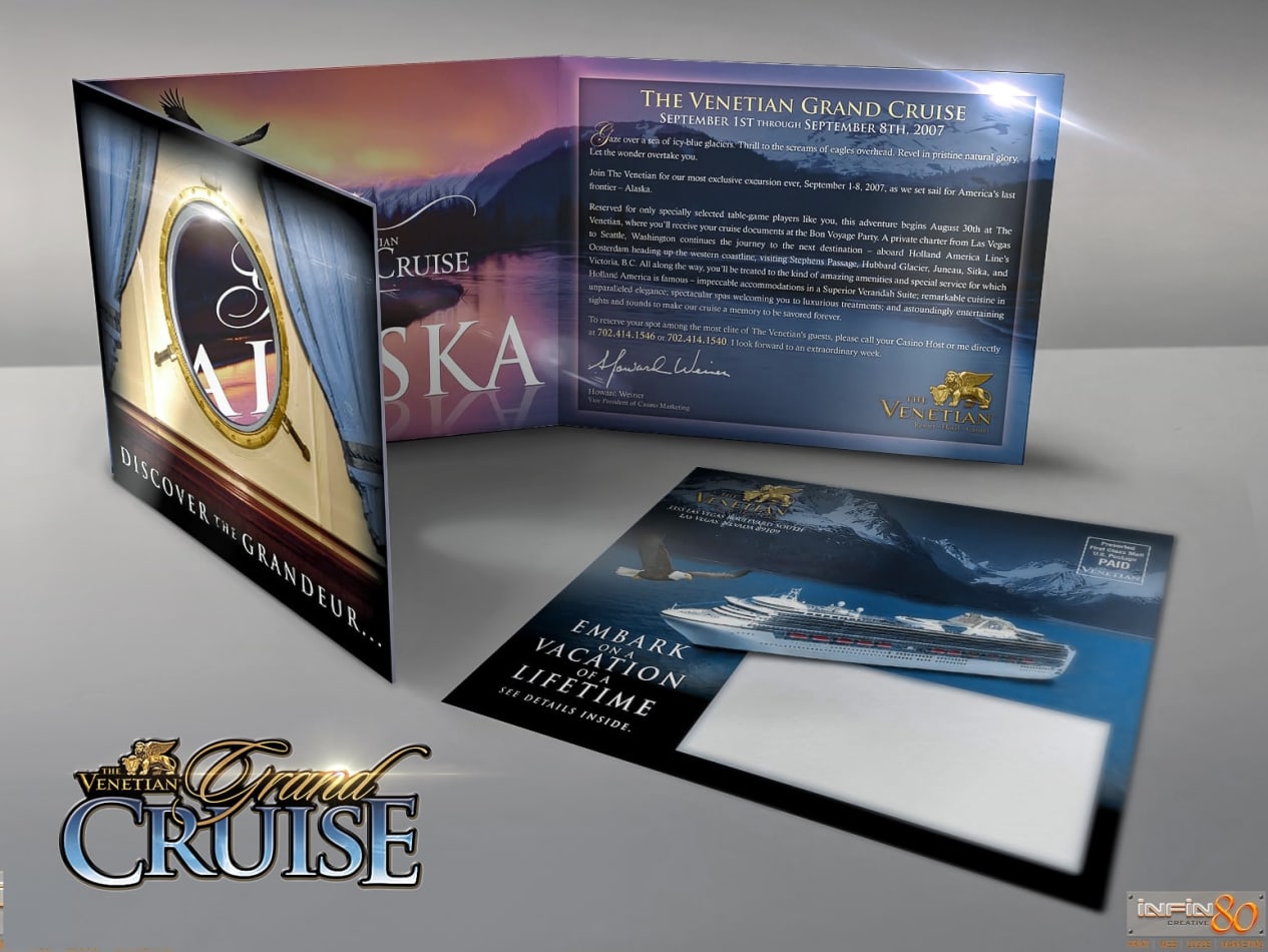 Tri-fold die-cut complimentary Alaskan cruise event invitation created for VIP members courtesy of The Venetian Casino, Hotel & Resort