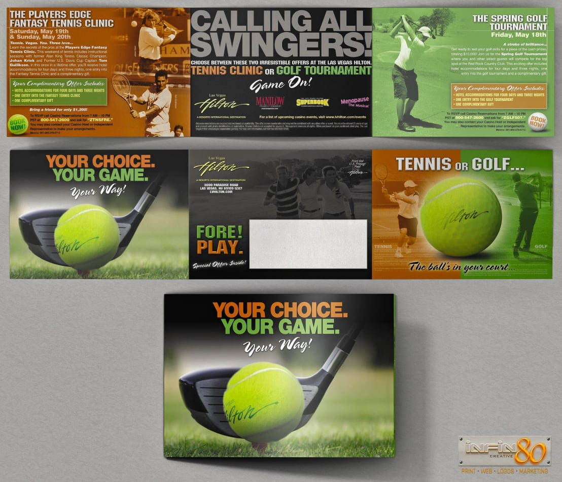 Direct mail trifold Tennis or Golf brochure event invitation for Las Vegas Hilton’s high level players